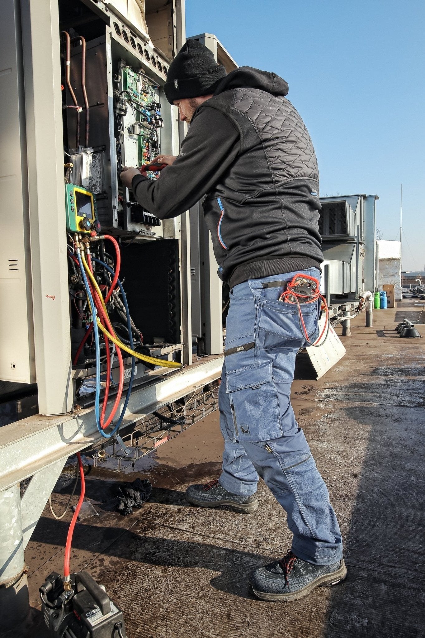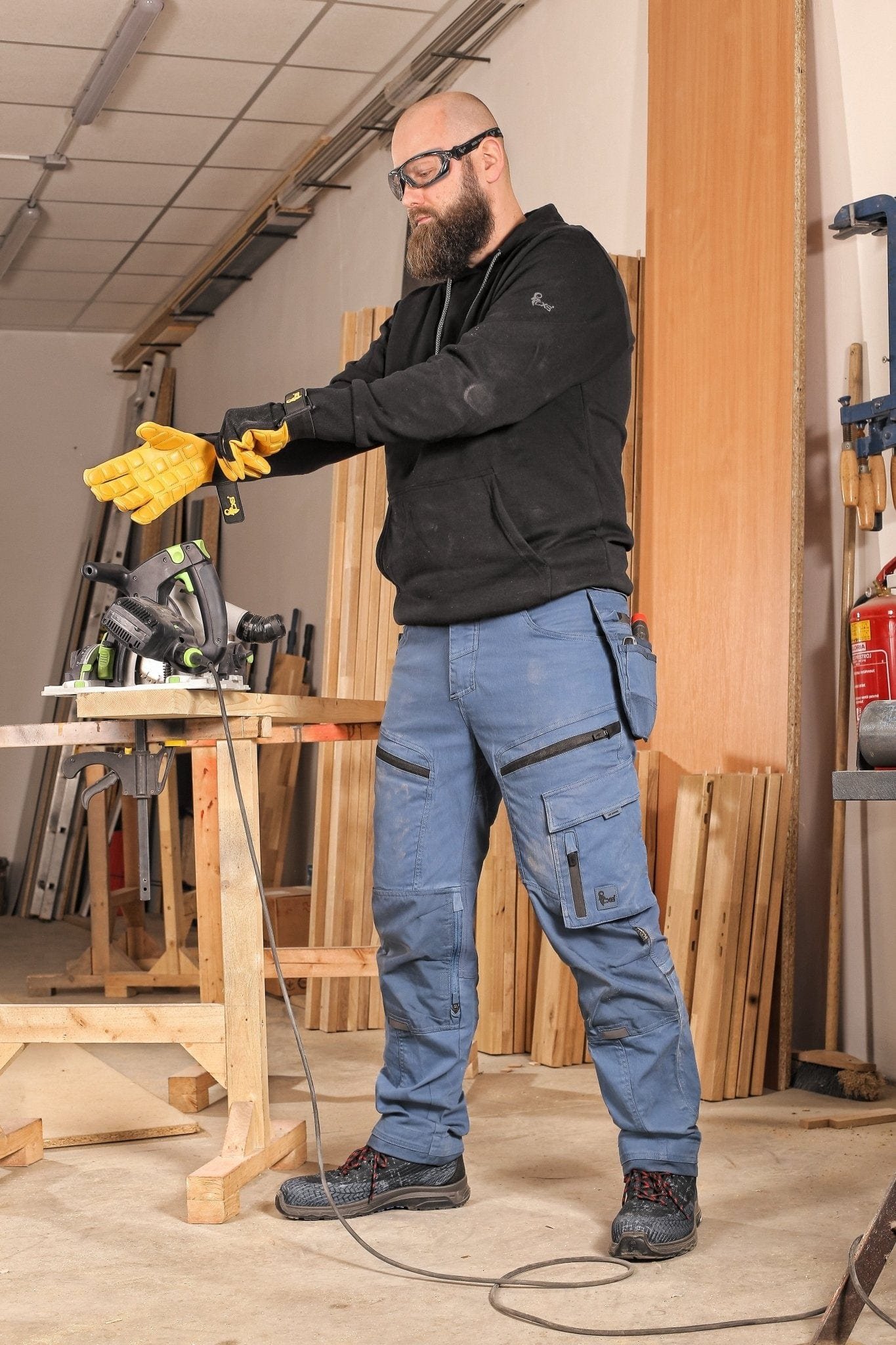 • Men’s work pants in a modern slim-fit cut. The combination of high-quality blend material with elastane and 4-way stretch construction in exposed areas allows easy and comfortable movement.