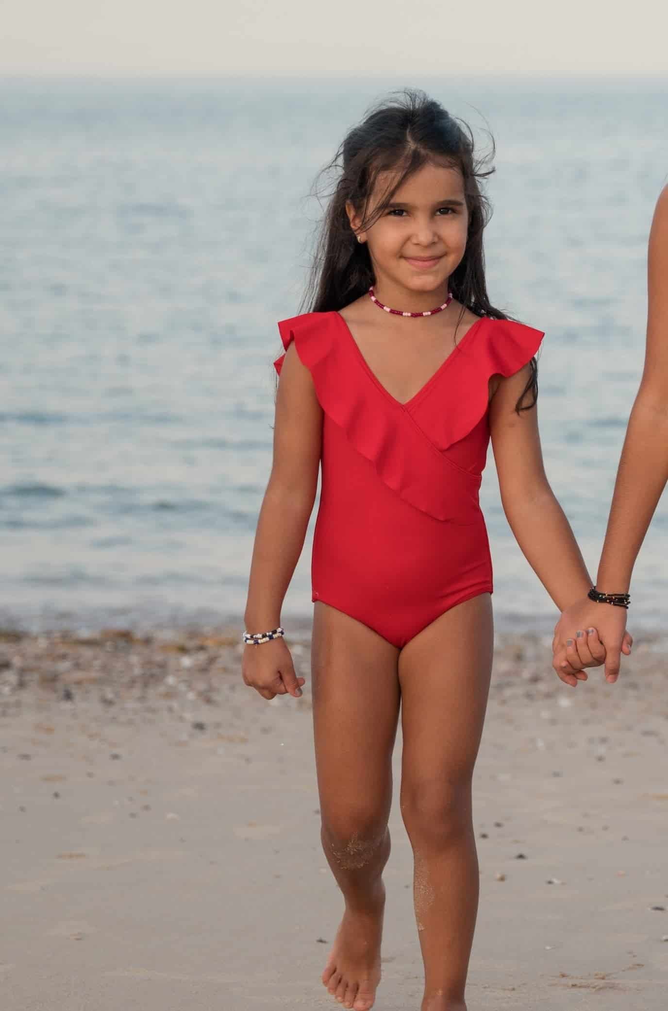 A red ruffle one piece for your little girls! You can match your little one in our matching red ruffle swimsuit for Moms!